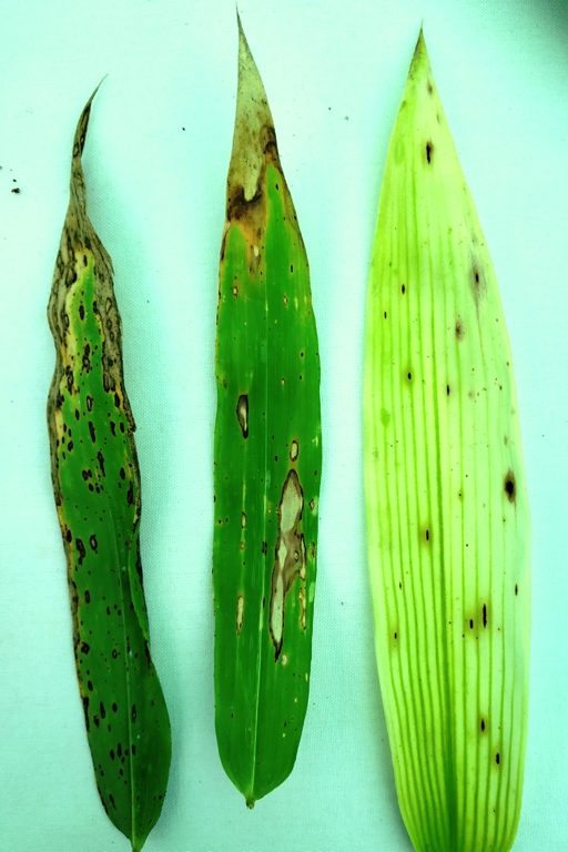 2. Infection spots are grey, brown, black, yellow, white and dark brown, vary in size and shape and coalesce to form larger spots.