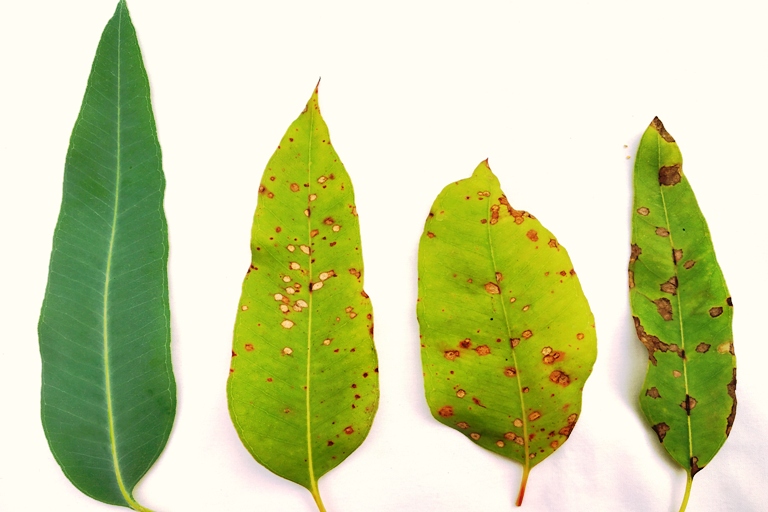 1. Infected leaves exhibit different coloured spots which are circular and irregular in shape. Depending up on the pathogen, the colour of the spot varies.