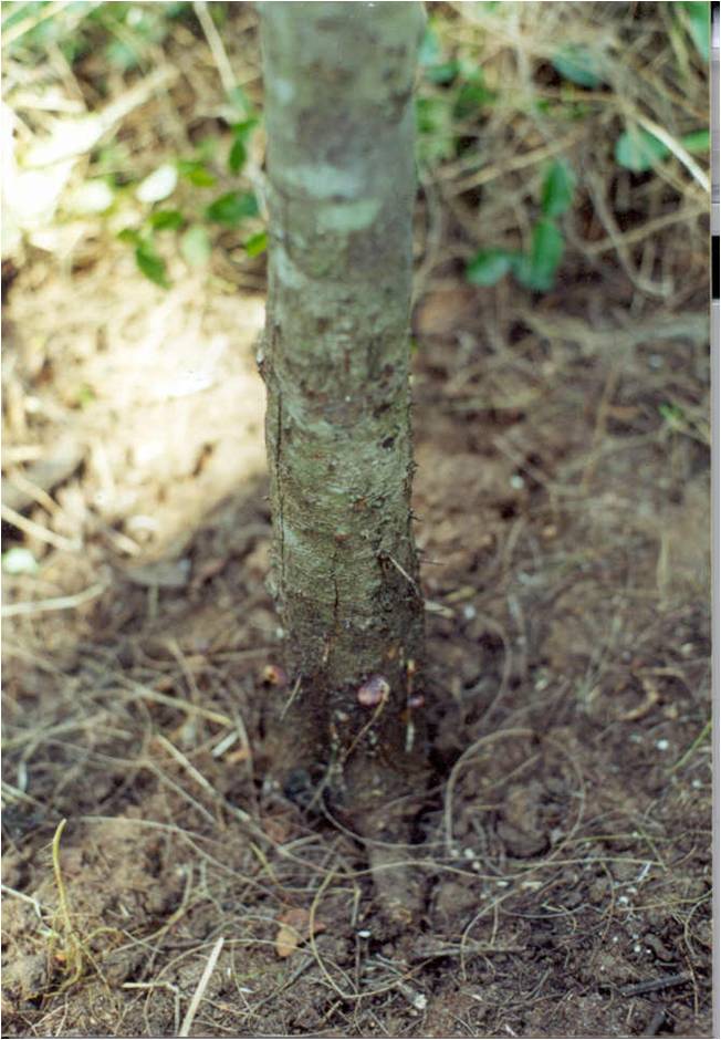 f) Fruiting bodies or sporophores of root-rot fungi develop readily on root and stem bases. White mycelial sheets seen on the affected portion of the trees.