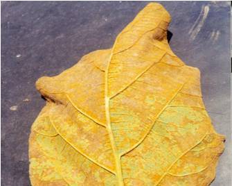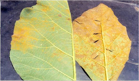 1. Disease occurs during October to February in nurseries where Teak plants are raised and maintained. Infected leaves are almost plastered with yellowish brown fruit bodies of the fungus. The upper leaf surface presents a grey appearance due to the formation of fleeks, which correspond to the position of position of fungal spore structure on the lower surface. Infected leaves fall off prematurely resulting in retardation of plant growth.